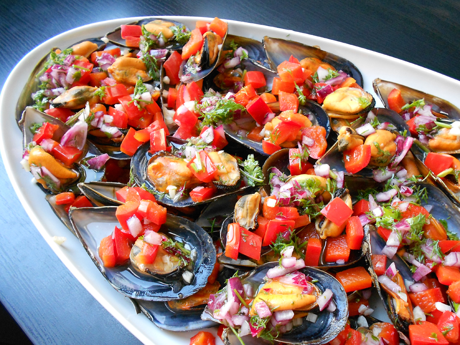 Numa travessa grande colocam-se os mexilhões, removendo a parte de cima da concha (deixando apenas o lado que contém o mexilhão) e cobre-se com o preparado do frasco. Servir acompanhado com fatias de pão. Ficaram deliciosos, e com um colorido fantástico. É uma entrada óptima que se pode fazer com alguma antecedência e reservar no frigorífico até ao momento de servir.